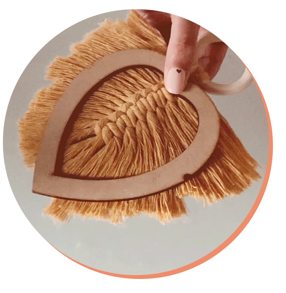 Muchas de las creaciones de Macramé tienen terminaciones con flecos, como son las amadas hojas o plumas, pasa vasos, individuales, espejos.
